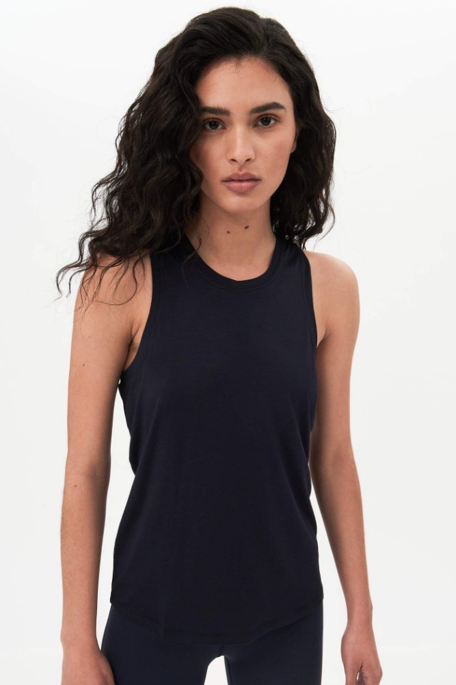 This light weight natural jersey tank Indigo can be worn alone or as a layer over a sports bra. Wear it knotted for a touch of street style.